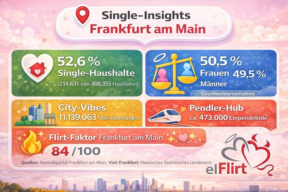 Singles aus Frankfurt am Main finden Frankfurt am Main ist statistisch gesehen ein starkes Pflaster zum Kennenlernen: Eine hohe Single-Haushaltsquote, ein nahezu ausgeglichenes Frauen/Männer-Verhältnis und viel Bewegung durch Pendler, Besucher und das internationale Stadtleben sorgen für ständig neue Begegnungen. 84 / 100 – sehr hoch, weil Frankfurt viele Single-Haushalte hat und durch Job-Markt, Pendler, Events und internationale Gäste ständig neue Dating-Gelegenheiten entstehen.